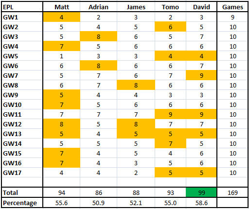 > A-League Round 12/EPL Gameweek 18 Megatips > EPLGW17