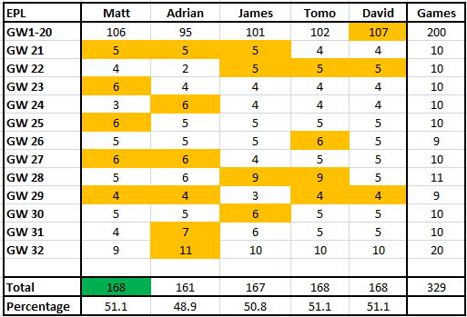 > A-League Finals 3/EPL Gameweek 34/Super Rugby Round 8/NRL Round 7/AFL Round 3 Megatips > EPLGW32
